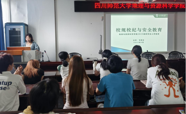 随后,以“校规校纪与安全教育”为主题,结合具体案例,重点解读了《四川师范大学研究生教育管理办法(试行)》中关于学籍管理、课程考核、科研实践、日常行为规范等方面的核心条款,明确了新生在请假销假、学术活动参与、校园公共秩序维护等方面的具体要求。同时,结合校园生活实际,她从人身安全、财产安全、消防安全等维度开展安全教育,通过案例提醒新生提高安全防范意识,引导新生将安全意识融入日常学习生活的每一个细节。