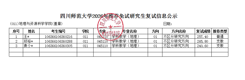 四川师范大学地理与资源科学学院2026年推荐免试研究生复试信息公示